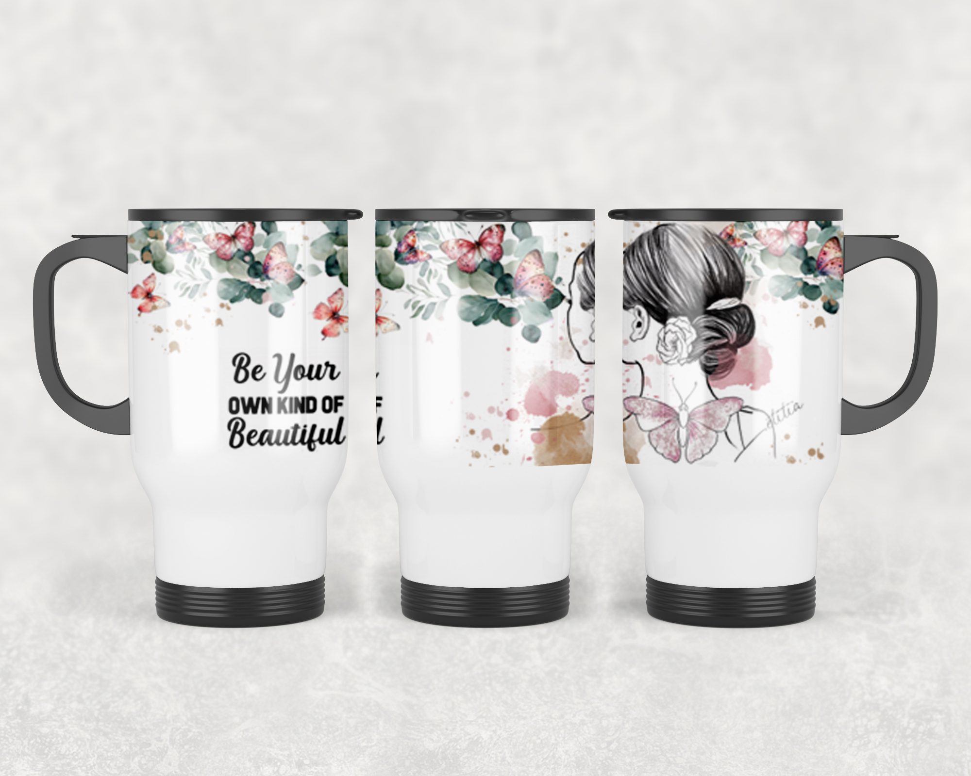 Each travel mug is inspired by her original sketches by Letitia, bringing artistic flair and individuality to the product.